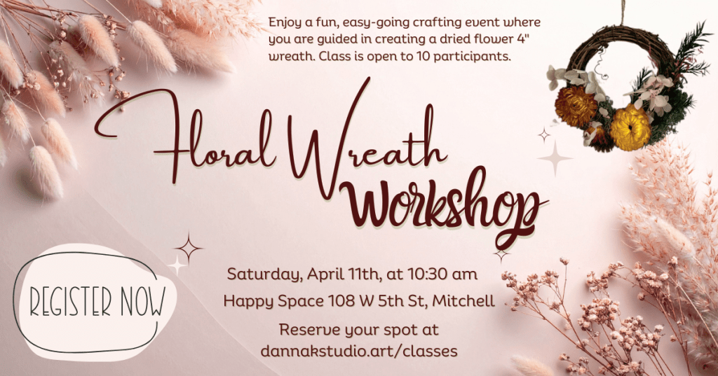 Enjoy time spent crafting a unique floral wreath using a variety of colors in dried grasses, flowers, and mosses. Class size is limited to 10. Supplies provided.